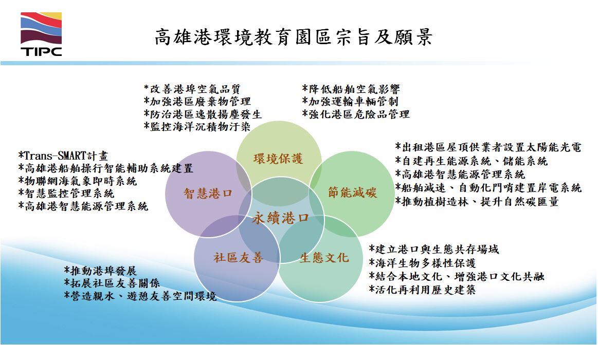 高雄港以「環境保護、智慧港口、節能減碳、社區友善、生態文化」為宗旨(圖1-1),致力「打造永續港口」為願景,透過多項環境教育相關活動之辦理,提升員工環保先備知識,持續以創新、永續、環境友善理念納入營運方針之中,並提供民眾寓教於樂的課程與活動,融入本場域特色及科技管理中,以建構深具港埠特色的環境教育設施場所。